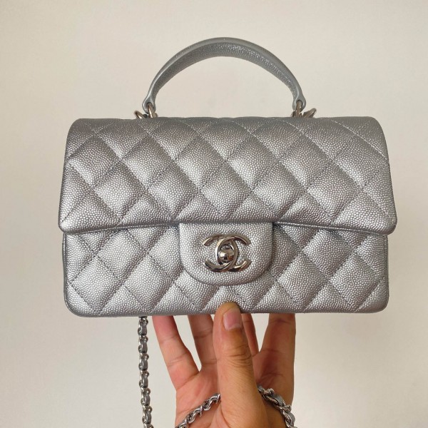 샤넬 핸들 장식의 미니 플랩백 메탈릭 그레인드 메탈 실버 AS2431-B05576-45002