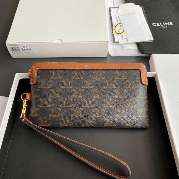 셀린느 트리옹프 롱 스트랩 캔버스 카프스킨 클러치 백 탄 파우치 탠 10K672ECM