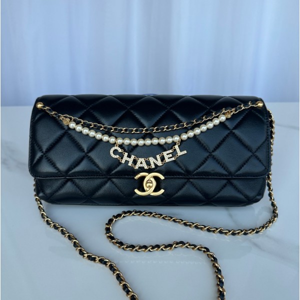 샤넬 스몰 플랩 백 램스킨, 이미테이션 펄, 골드 메탈, 블랙 AS5011