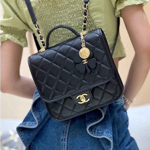 샤넬 25FW 사각 백팩 체인 탑핸들 플랩 CC로고 클로버 백참 블랙 캐비어 AS5715